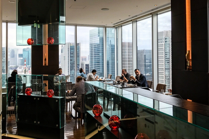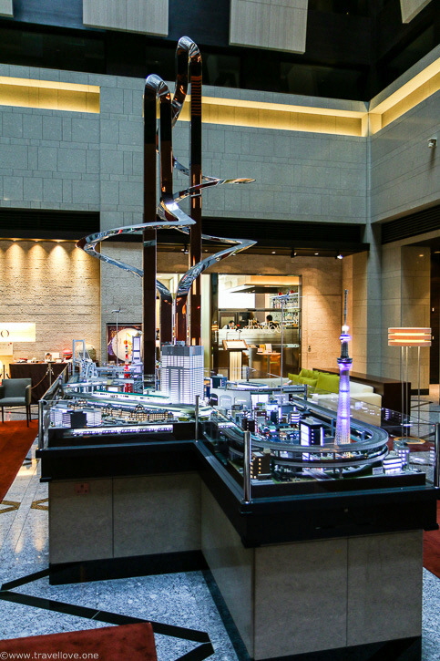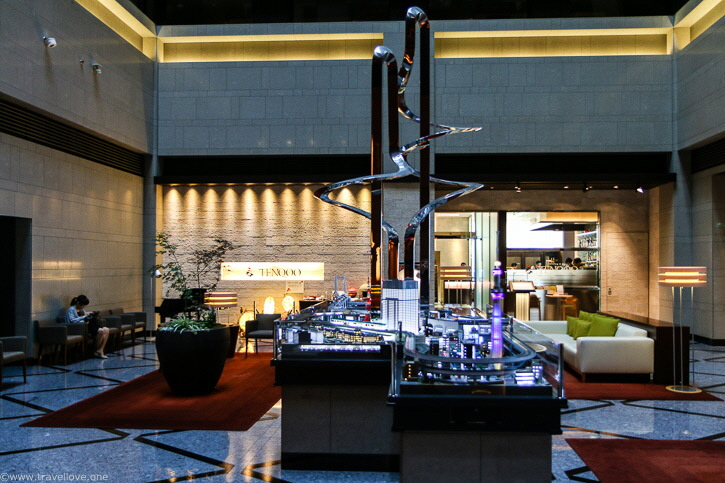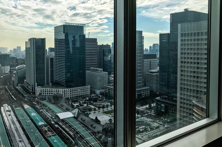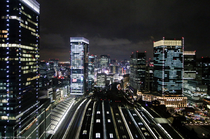 The hotel is located in the top floors of Sapia Tower, one of the corner buildings of Tokyo Station. One of the exits of the station´s underground maze of shops, restaurants and platforms leads right to the entrance of the tower. From there you take the elevator to the 27th floor to reach the lobby of the hotel. The modern and comfortable design makes it a nice place to come home to after exploring the fascinating city of Tokyo. And if you still don´t have enough of the city, book a room with a view as we did.