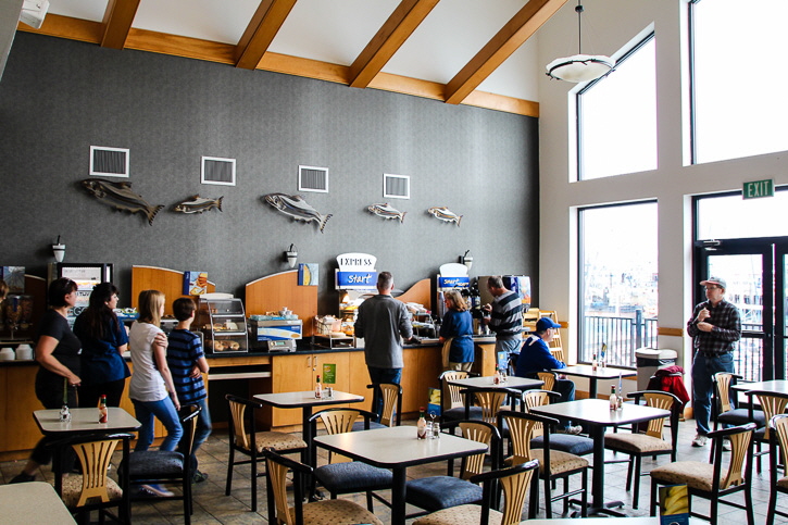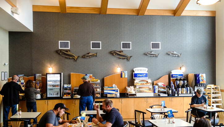 The breakfast buffet was good and simple, but tasty. The breakfast room offered great views on Small Boat Harbor and the cruise ship pier. Remarkable, especially for us as Europeans, was the discrepancy between Seward´s mottos of eco-friendliness and sustainability and the extremely wasteful use of plastic and paper cups and plastic cutlery at the buffet.